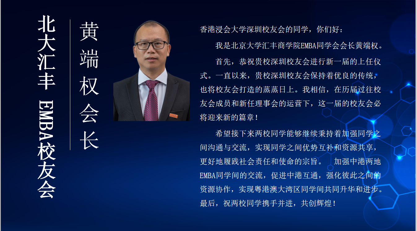 于会长的发言感情真挚、激情豪迈,让现场与线上的校友们都感受到了新一届校友会运营团队的昂扬斗志,看到了新班子崭新的精神面貌。仪式上,还播放了北京大学汇丰商学院EMBA同学会会长黄端权、香港浸会大学大湾区校友会会长何纬丰,以及刚刚获得沙漠挑战赛金沙鸥奖的“浸泡团”团长叶龙与参赛队员的祝贺视频。